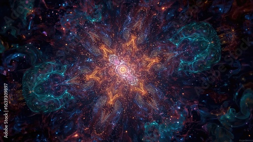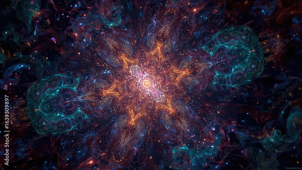 Wall mural : Bright and colorful fractal artwork displaying an enchanting star explosion surrounded by particles -