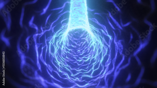 The watermark will not be included on Wall mural.: Bright glowing blue electric tunnel with dynamic wireframe lines and neon energy pulses, simulating