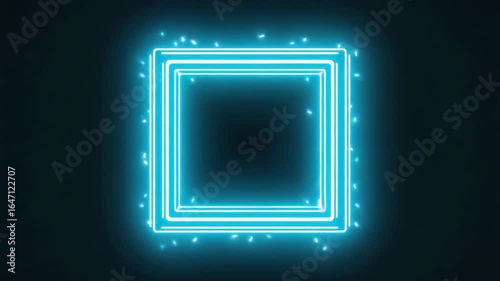 The watermark will not be included on Wall mural.: Bright glowing neon light square frame with particles floating around it on a dark background create