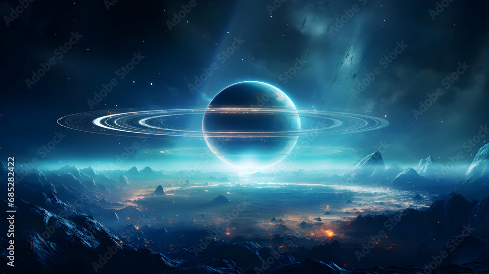 The watermark will not be included on Wall mural.: Bright luminous planet with rings on the outer space - ,generative ai -