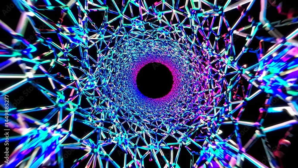 Bright neon geometric lines are rotating and creating an abstract vortex with a black hole in the ceWall mural