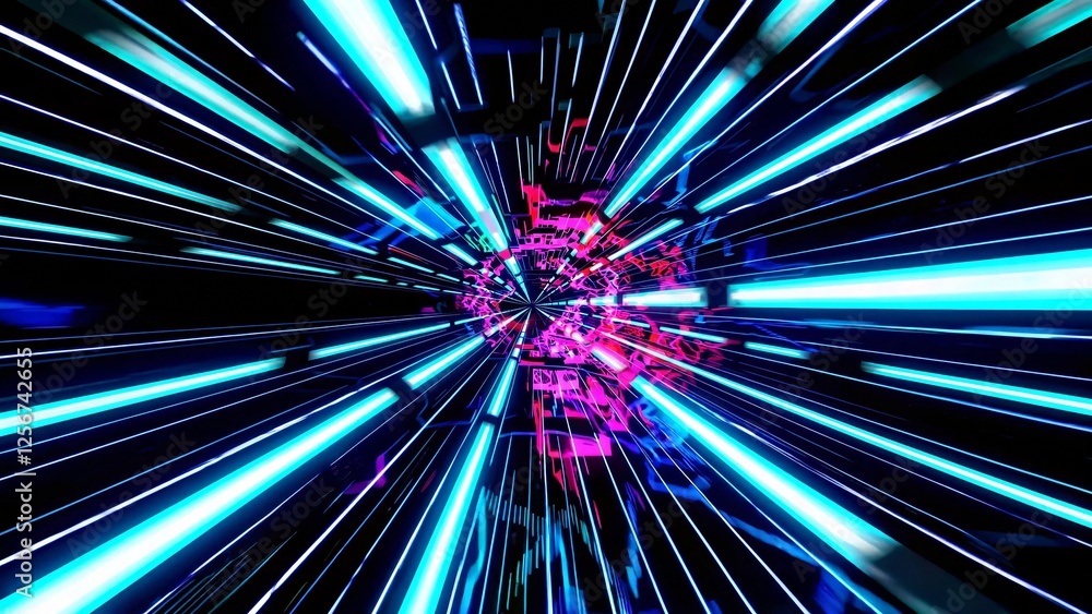 The watermark will not be included on Wall mural.: Bright neon lights creating a mesmerizing tunnel effect with dynamic motion blur, evoking the sensat