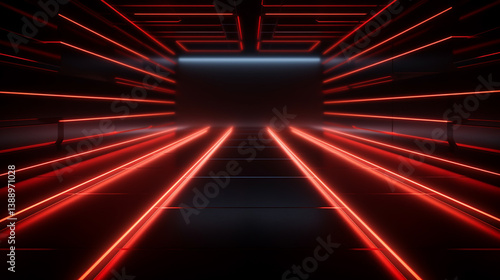 The watermark will not be included on Wall mural.: Bright red neon laser lights illuminate the darkness creating lines and triangle shapes in sci-fi ef
