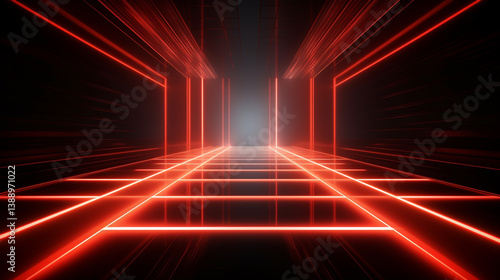 The watermark will not be included on Wall mural.: Bright red neon laser lights illuminate the darkness creating lines and triangle shapes in sci-fi ef