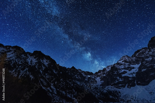 Wall mural bright starry sky with the milky way on the background of high tatras mountains