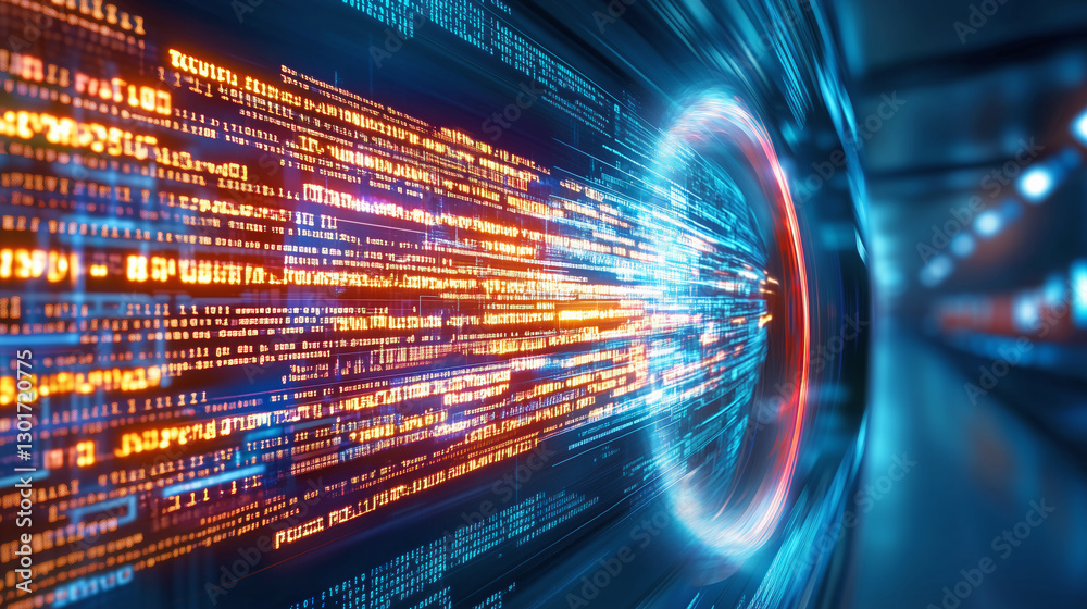 Wall mural bright streams of binary codes and colors rush through a sleek tunnel, showcasing the rapid movement