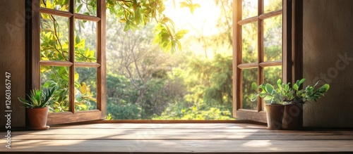 Wall mural : Bright sunrise through rustic colonial window with lush greenery outside and empty space for overlay