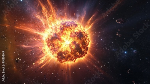 Wall mural bright supernova explosion, sending shockwaves and debris outward from a dying star in deep space - Wall murals Wall mural bright supernova explosion, sending shockwaves and debris outward from a dying star in deep space - Wall murals