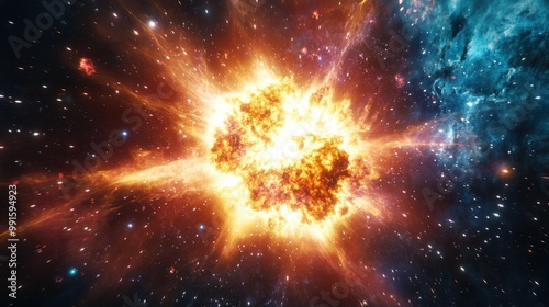 Wall mural bright supernova explosion, sending shockwaves and debris outward from a dying star in deep space - Wall murals Wall mural bright supernova explosion, sending shockwaves and debris outward from a dying star in deep space - Wall murals