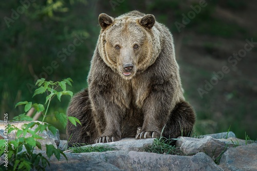 Wall mural : Brown bear (ursus arctos) big male sitting on the stones, relax after a meal