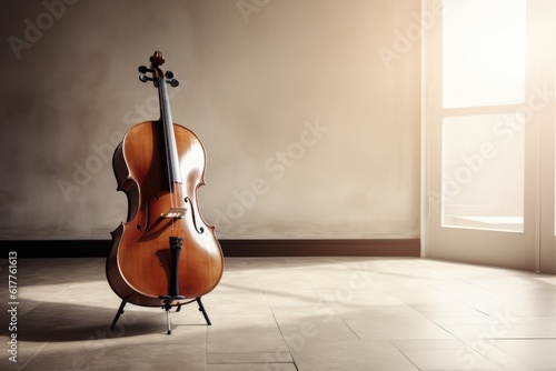 The watermark will not be included on Wall mural.: Brown cello displayed next to window in sunny room, created using generative ai technology