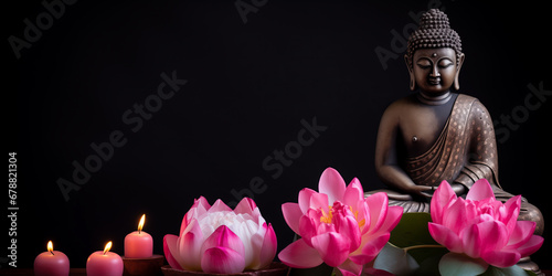Buddha statue meditate with flowers lotus on dark background - banner vesak dayWall mural