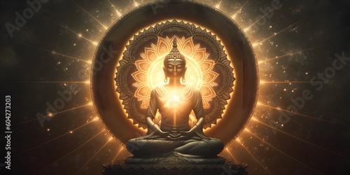Buddha statue transcendental spiritual meditation with aura, banner yellow light - generation aiWall mural