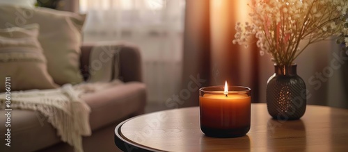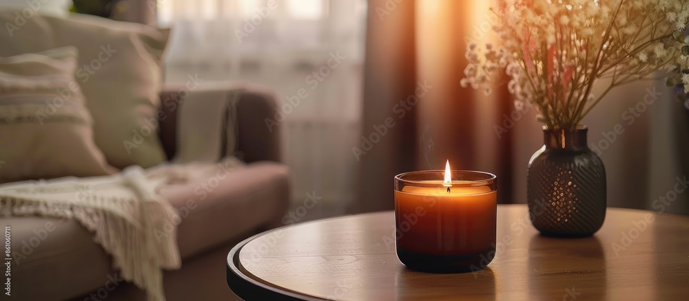 The watermark will not be included on Wall mural.: Burning scented candle on table at home - with copy space image - place for adding text or design