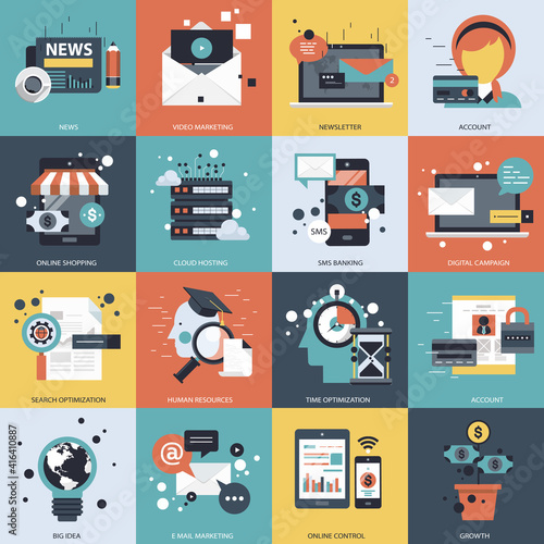 Wall mural business, technology and management icon set for websites and mobile applications. flat vector illus