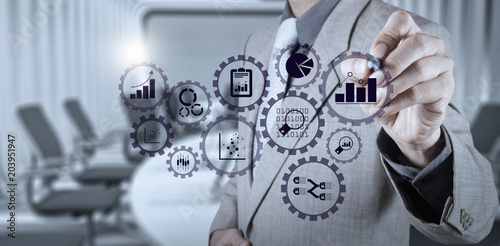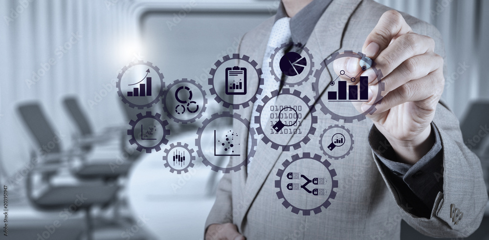 Business data analytics management with connected gear cogs with kpi financial charts and graph - Wall mural