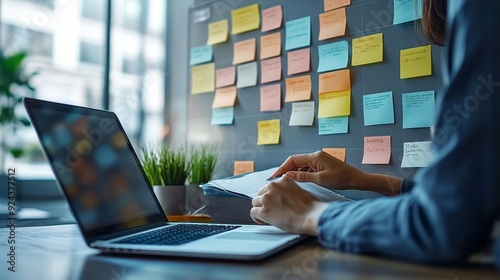 The watermark will not be included on Wall mural.: Business developer using kanban board framework on laptop computer - agile software development lean