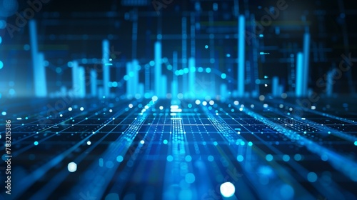 Wall mural business dynamics blue background with digital chart, internet skyscraper backdrop science computer