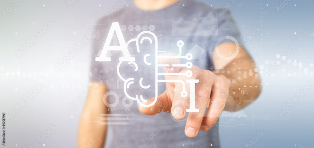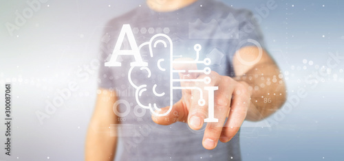 Wall mural business man holding artificial intelligence icon with half brain and half circuit 3d rendering - Wall murals Wall mural business man holding artificial intelligence icon with half brain and half circuit 3d rendering - Wall murals