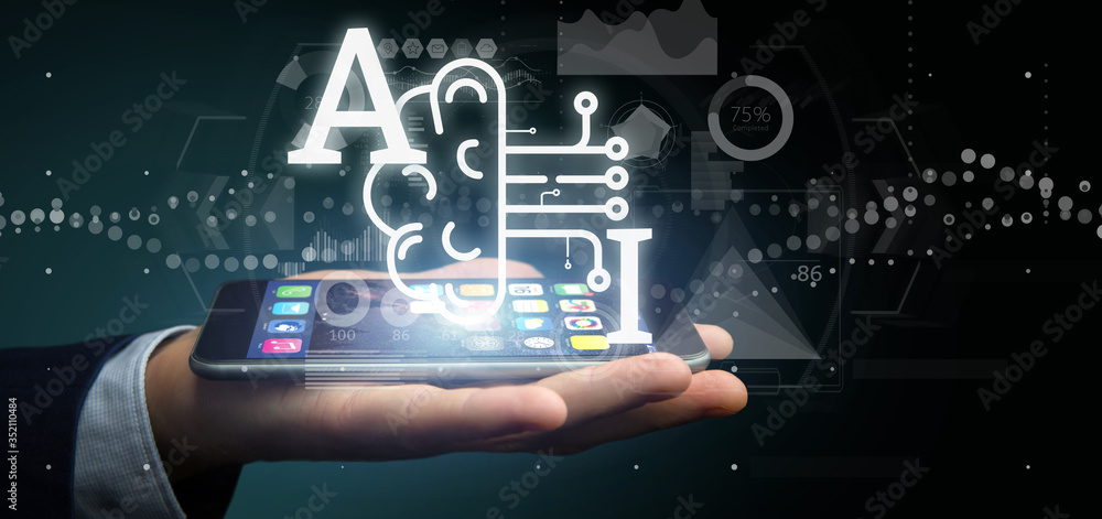Wall mural business man holding artificial intelligence icon with half brain and half circuit 3d rendering - Wall murals Wall mural business man holding artificial intelligence icon with half brain and half circuit 3d rendering - Wall murals