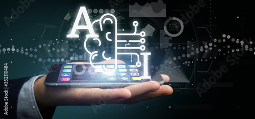Wall mural : Business man holding artificial intelligence icon with half brain and half circuit 3d rendering