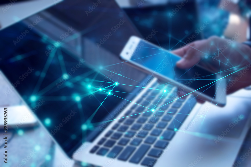Wall mural business man with smartphone mobile and laptop notebook computer in network social digital online co - Wall murals Wall mural business man with smartphone mobile and laptop notebook computer in network social digital online co - Wall murals