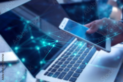 Wall mural : Business man with smartphone mobile and laptop notebook computer in network social digital online co