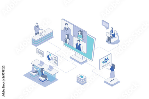 Wall mural : Business meeting isometric concept in outline isometry design for web - people connectingin by video