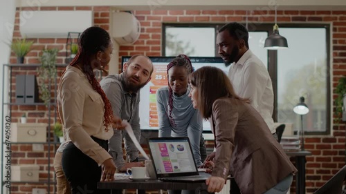 The watermark will not be included on Wall mural.: Business people doing teamwork for project planning in office, using files with statistics and lapto