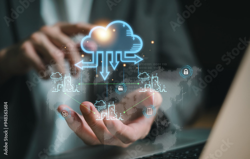 Wall mural : Business person migrate data and corporate information into cloud technology for data security and b