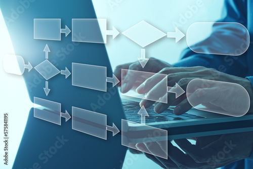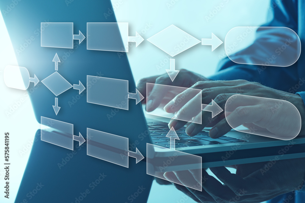 Wall mural : Business process and workflow - flowchart and laptop - close up of hands typing -