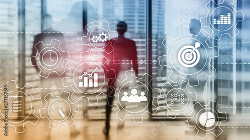 Business process automation concept - gears and icons on abstract background - Wall mural