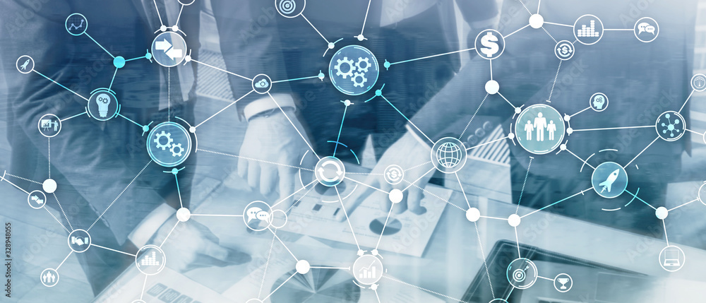 Wall mural business process structure industrial workflow diagram automation innovation concept on virtual scre