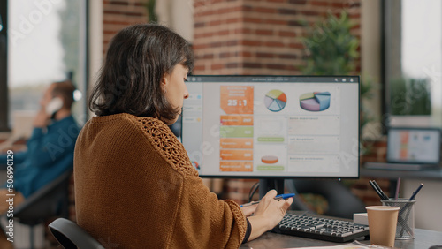 Business woman working on project planning with rate charts and information, using computer keyboardWall mural