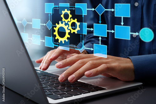 Wall mural business workflow automation. flowchart and gear icons. businessman using laptop computer with autom