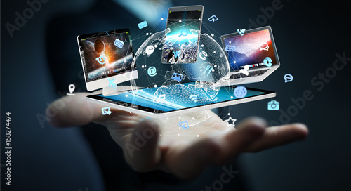 Wall mural businessman connecting tech devices to each other 3d rendering - Wall murals Wall mural businessman connecting tech devices to each other 3d rendering - Wall murals