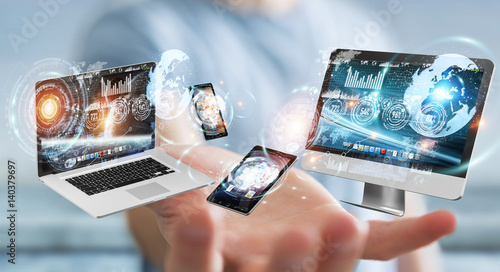 Wall mural businessman connecting tech devices to each other 3d rendering - Wall murals Wall mural businessman connecting tech devices to each other 3d rendering - Wall murals