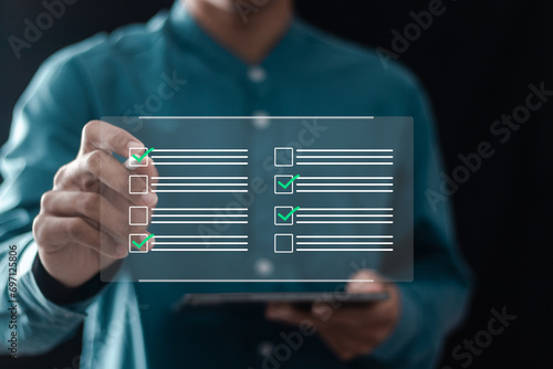 The watermark will not be included on Wall mural.: Businessman filling survey form online on questionnaire with checkboxes for answer questions of test