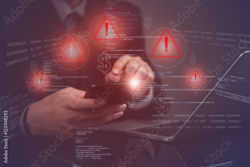 Wall mural businessman hand using a smartphone with warning and financial risk data. cybersecurity hacking thre - Wall murals Wall mural businessman hand using a smartphone with warning and financial risk data. cybersecurity hacking thre - Wall murals