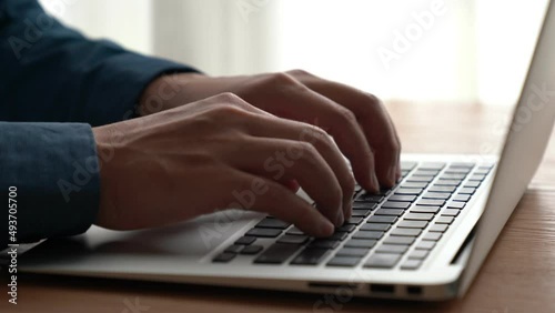 The watermark will not be included on Wall mural.: Businessman hand work on capable laptop computer at office table close up shot and selective focus a
