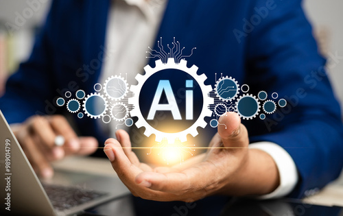 Wall mural businessman hold artificial intelligence ai technology for enhanced work efficiency data analysis an - Wall murals Wall mural businessman hold artificial intelligence ai technology for enhanced work efficiency data analysis an - Wall murals