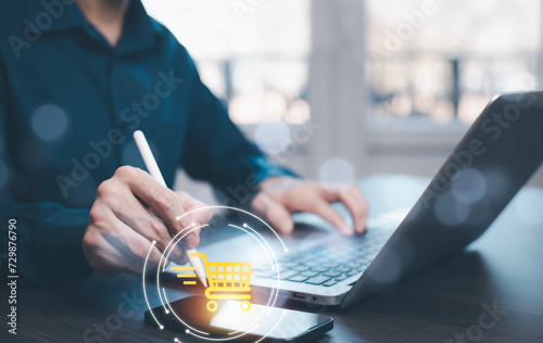 Wall mural : Businessman hold smartphone with online shopping concept, marketplace website with virtual interface