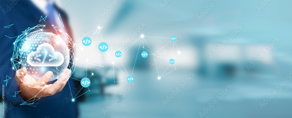 Wall mural businessman holds the circle of network structure, representing the core concept of software develop