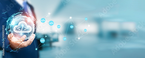 Wall mural : Businessman holds the circle of network structure, representing the core concept of software develop