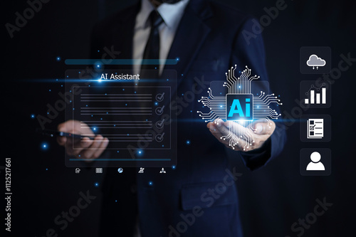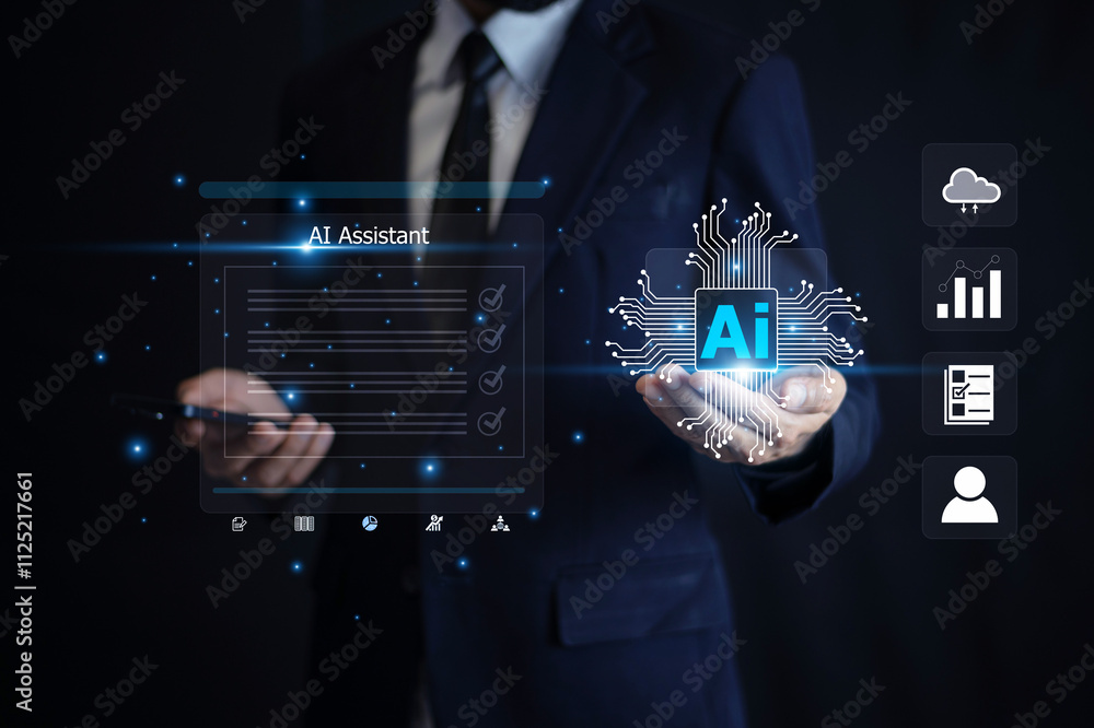 The watermark will not be included on Wall mural.: Businessman interacting with advanced ai technology, visualizing data-driven solutions and innovativ