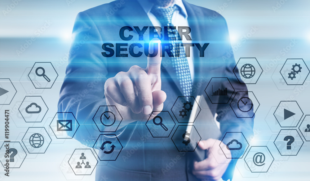 Wall mural businessman is pressing button on touch screen interface and selecting "cyber security". - Wall murals Wall mural businessman is pressing button on touch screen interface and selecting "cyber security". - Wall murals