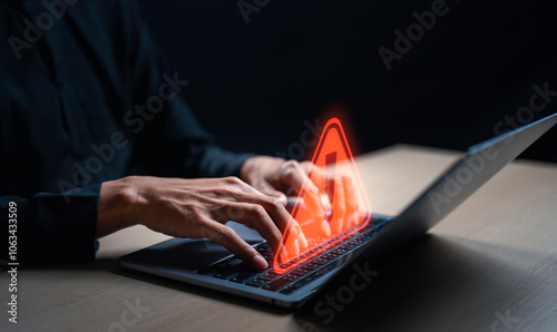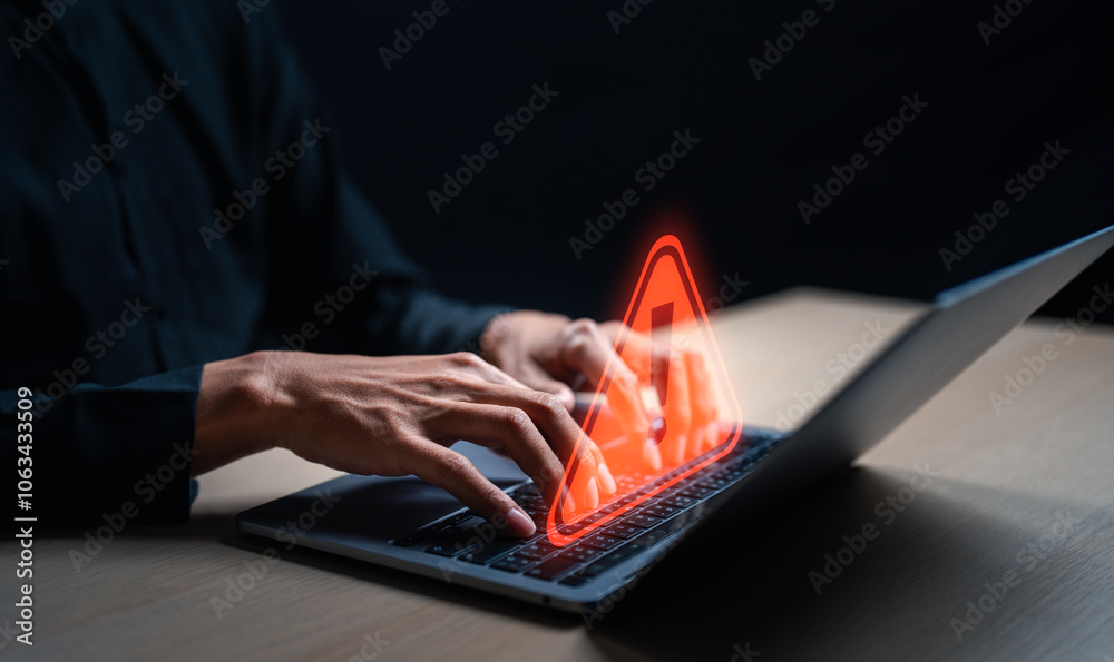 Wall mural businessman or programmer, developer using computer laptop with triangle caution warning sign for no - Wall murals Wall mural businessman or programmer, developer using computer laptop with triangle caution warning sign for no - Wall murals