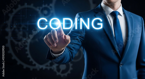 The watermark will not be included on Wall mural.: Businessman pointing at the word coding representing software development and technology innovation