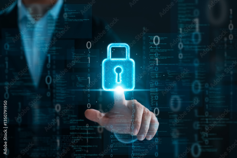Wall mural businessman touching padlock icon encryption security code protects company data and personal inform - Wall murals Wall mural businessman touching padlock icon encryption security code protects company data and personal inform - Wall murals