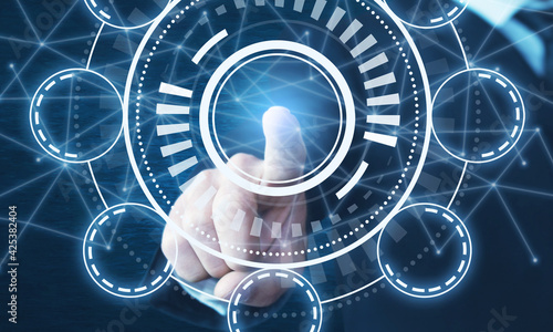 Wall mural businessman touching virtual interface button. internet. innovation. technology